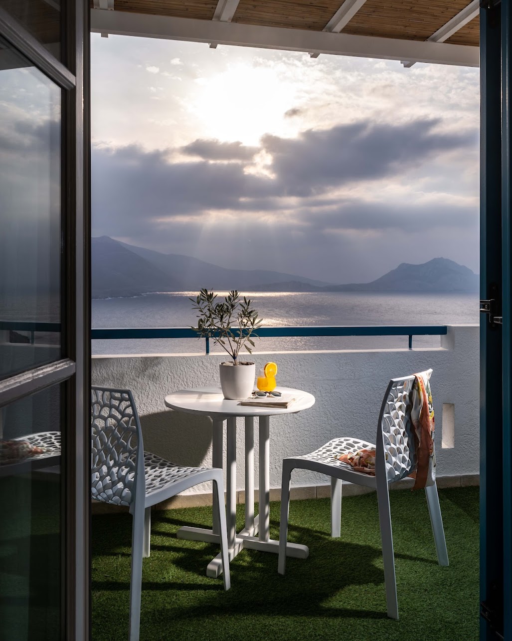Each room features a private balcony with sea view, private bathroom, AC, fridge, espresso machine & kettle, bathrobe, & slippers.