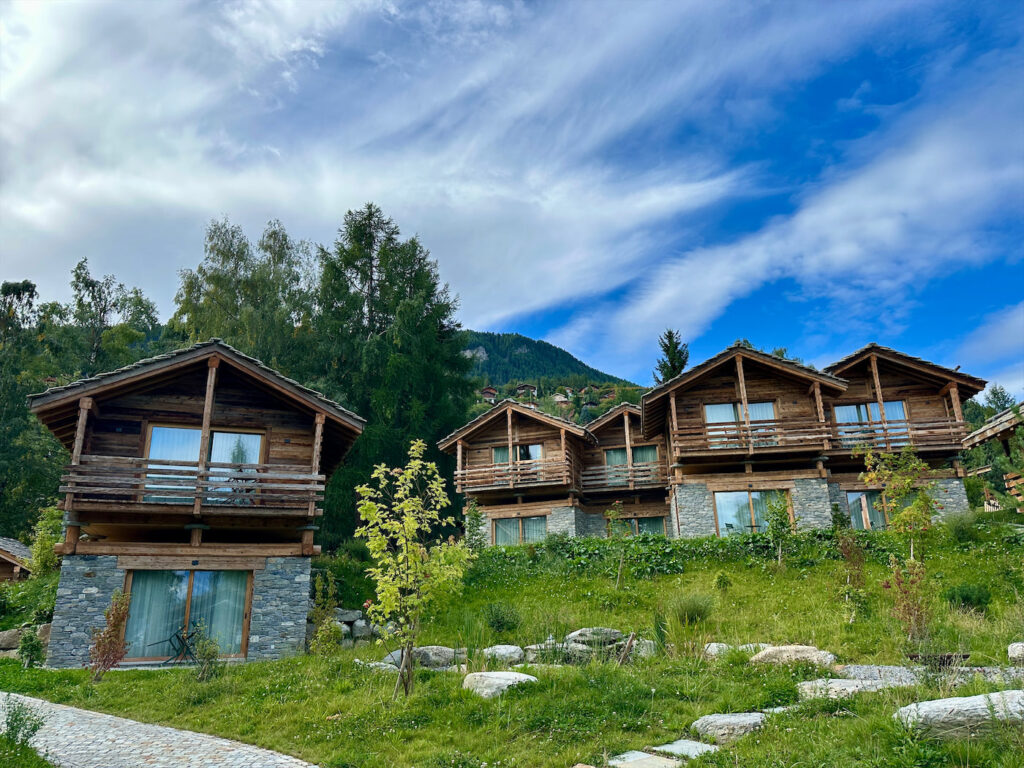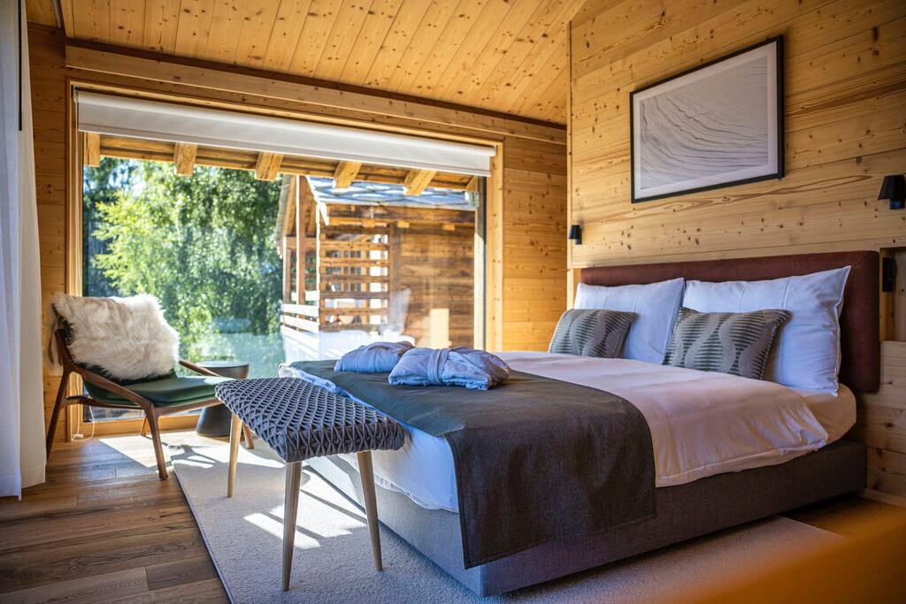 Come discover the comfort and elegance of these rooms located on the upper floor of our chalets. Each room, flooded with natural light through two large bay windows, offers breathtaking views of the Swiss Alps. They are equipped with a super king-size bed with individual duvets, a modern private bathroom, and a terrace to fully enjoy the view. Please note: rooms do not have fans or AC but balcony doors can be open for fresh air.